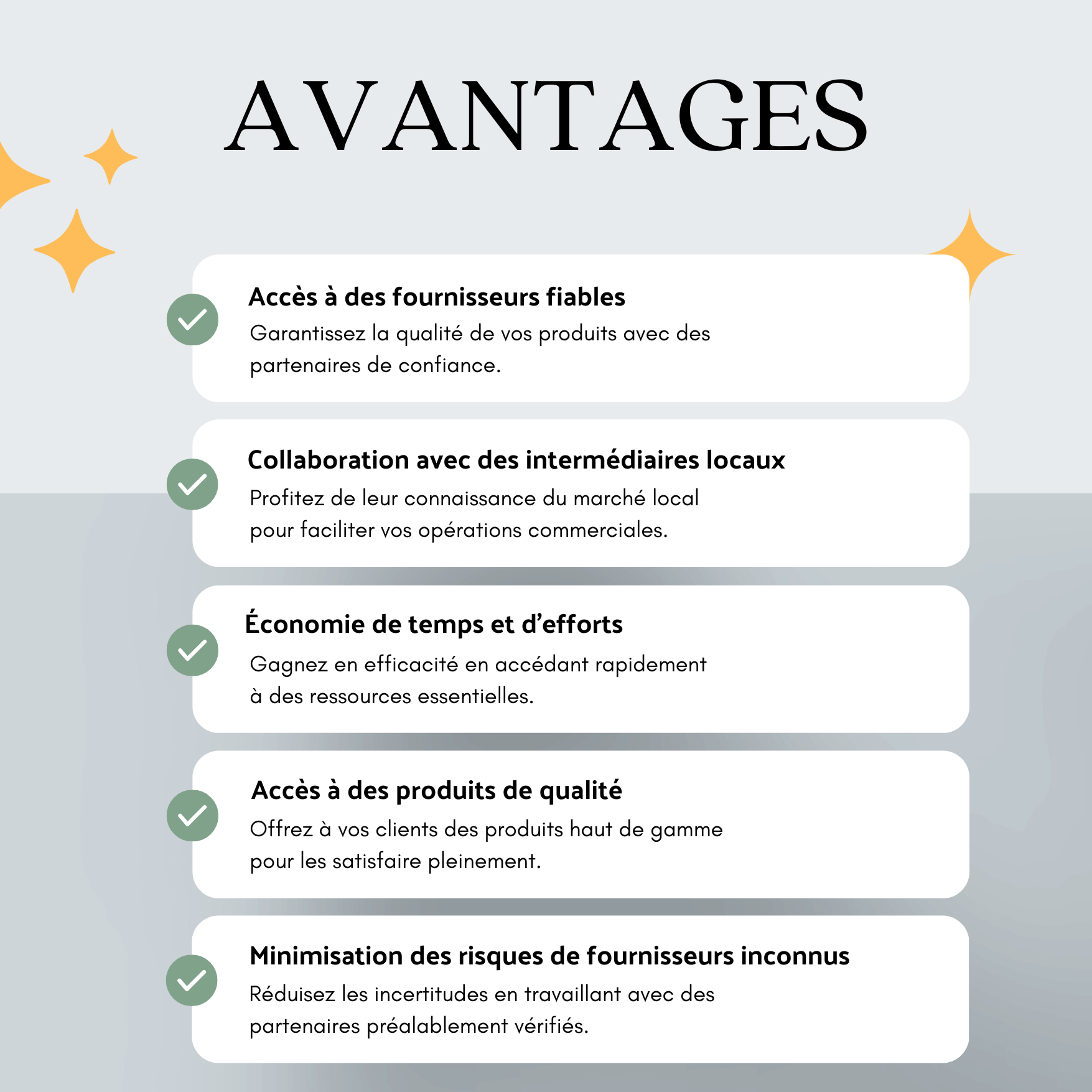 Le pack premium permet aux entrepreneurs de gagner du temps en centralisant l'accès à une variété de fournisseurs, facilitant ainsi la recherche, la sélection et la commande de produits, tout en garantissant une expérience d'achat fluide et efficace.