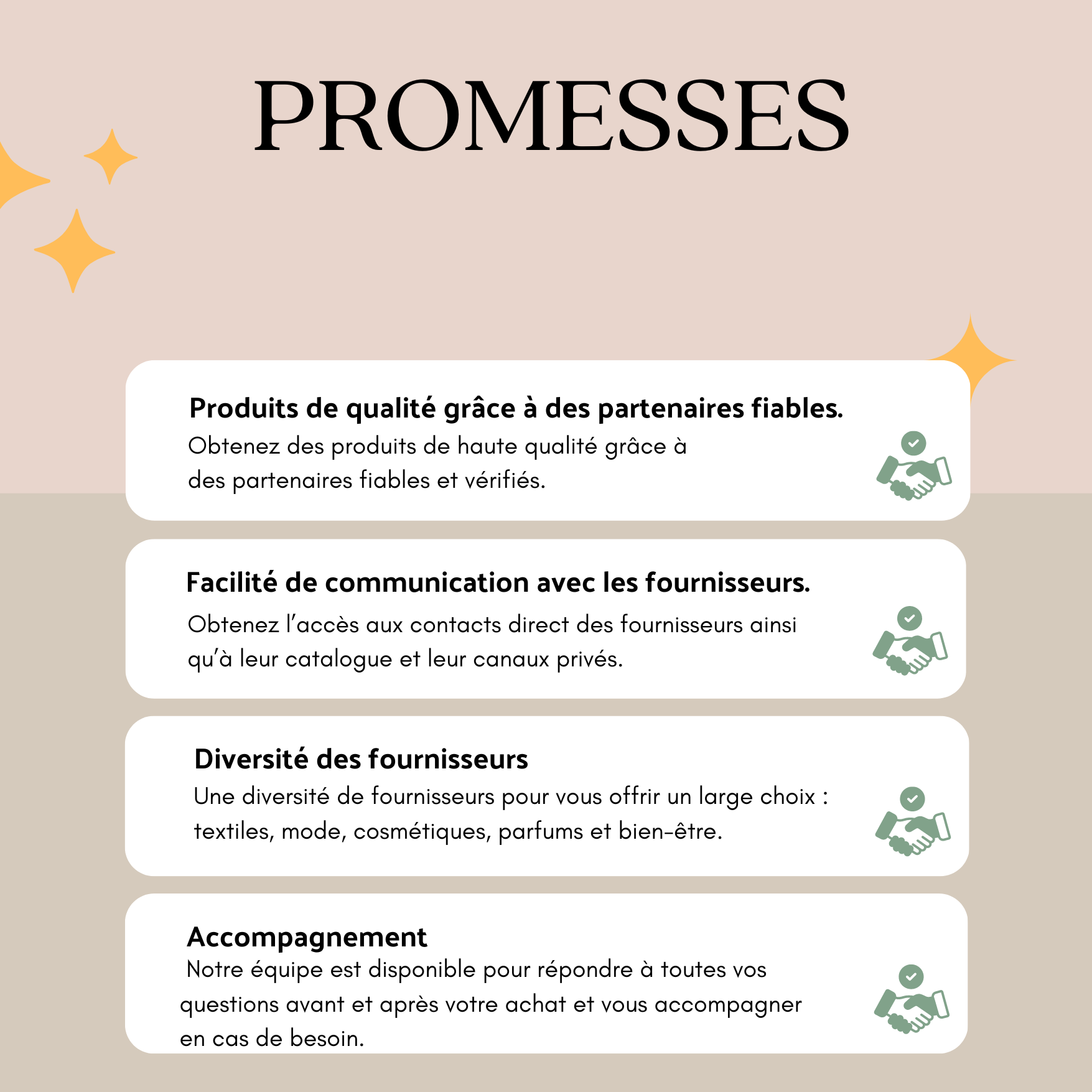 Grâce au pack premium, les entrepreneurs bénéficient d'une sélection minutieuse de fournisseurs fiables et réputés, ce qui leur permet d'obtenir des produits de haute qualité pour satisfaire les attentes de leur clientèle.