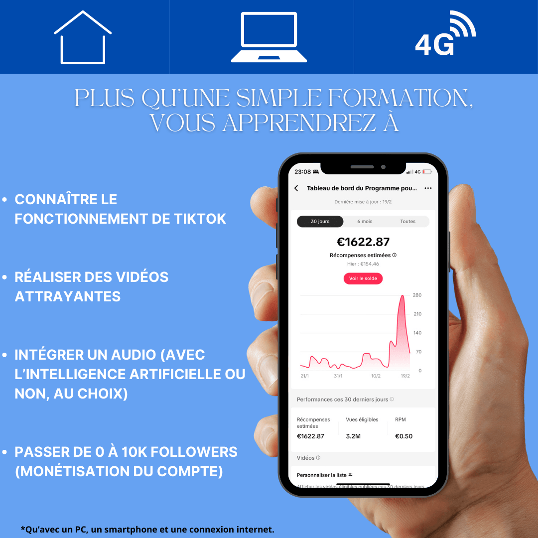 Conçue pour vous accompagner pas à pas vers la monétisation de votre compte. Avec cette formation, vous serez en mesure de créer des vidéos attrayantes et optimisées pour atteindre rapidement les 10 000 followers, seuil indispensable à la monétisation.